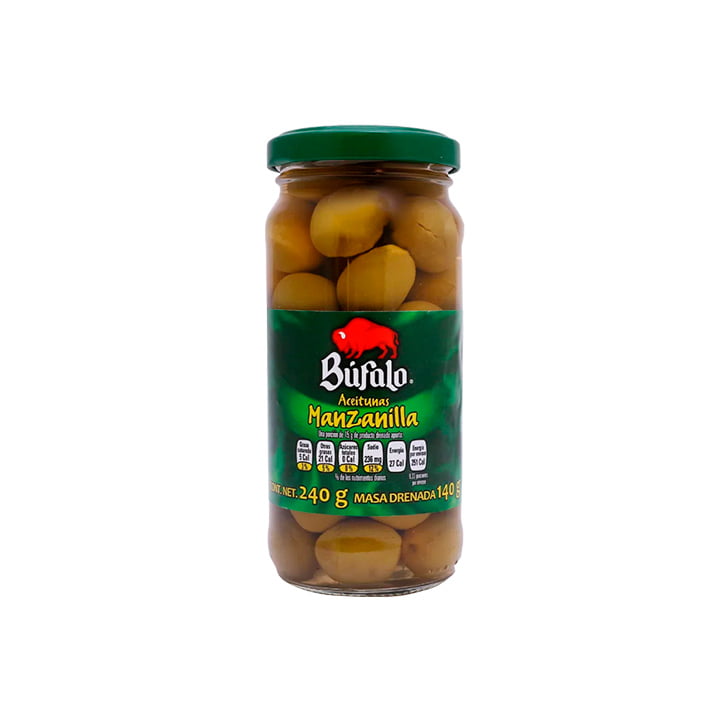Adquiere tu aceituna de manzanilla de la marca Búfalo en su presentación de 240 g. Las aceitunas son el fruto del olivo; el fruto del olivo tiene una composición en la que predominan los aceites y vitaminas solubles en lípidos como la vitamina A y la vitamina E. Sus ingredientes son: agua, aceituna manzanilla verde, sal, acido citrico y acido ascorbico