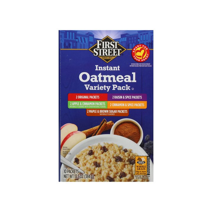Disfruta del sabor de la avena instantánea First Street. Su variedad de sabores te encantarán, ya que podrás tener la avena natural, con manzana y canela, canela y especias, miel y azúcar morena y claro, con pasas.