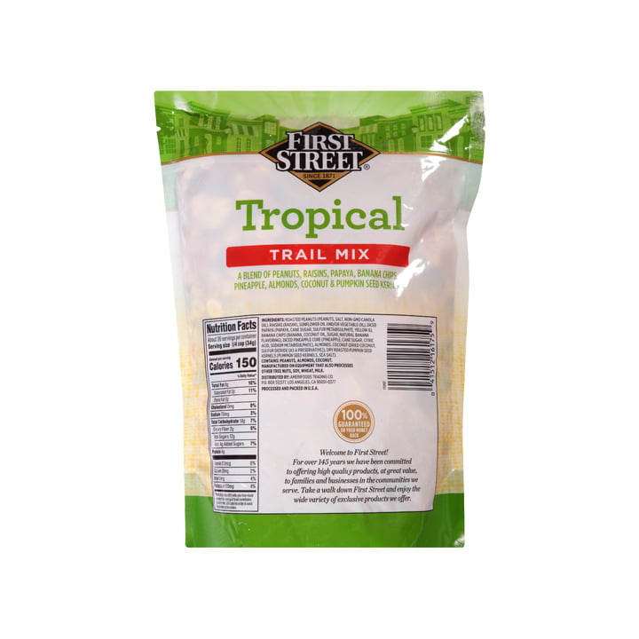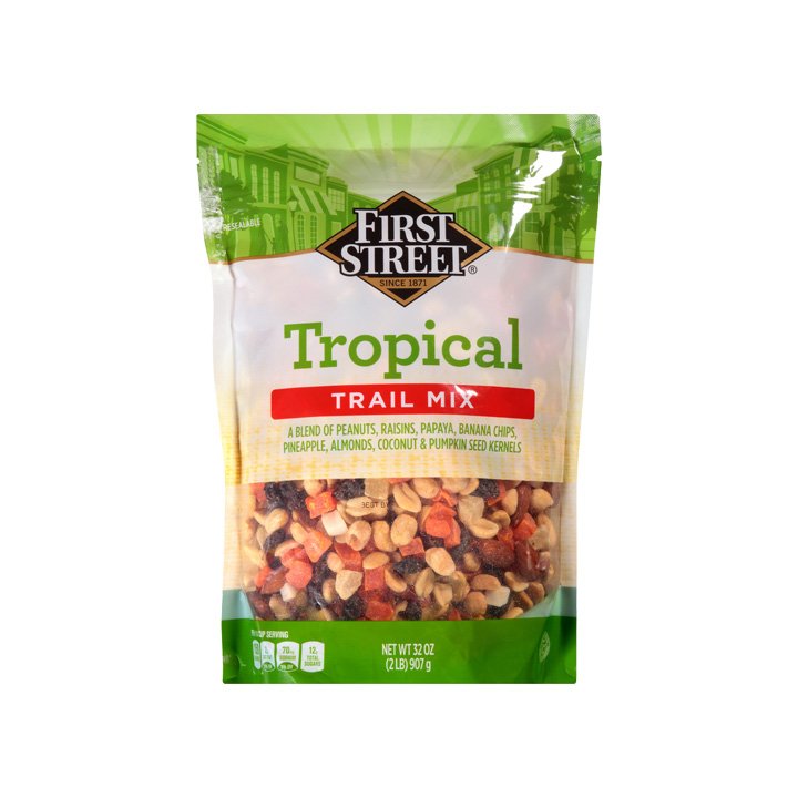 Lleva tu Botana mezcla tropical First Street para tus momentos de caminata, después del ejericio o botana con los amigos y familia.