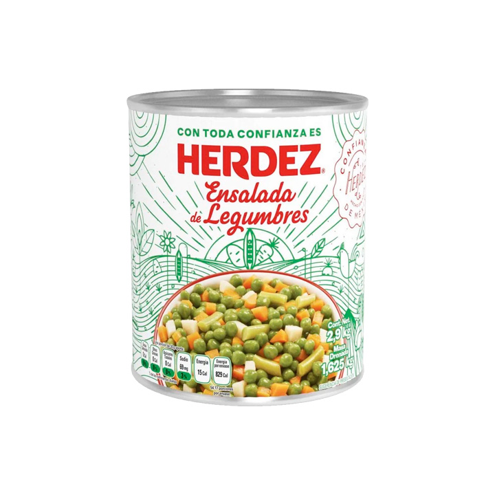 Adquiere la ensalada legumbres de la marca Herdez en su presentación de 2.90 kg. Está conformado de los siguientes ingredientes: agua, chícharo, papa, zanahoria, ejote, azúcar, apio, sal yodada y EDTA disódico. Visita nuestra categoría de abarrotes donde encontras variedad de productos similares.