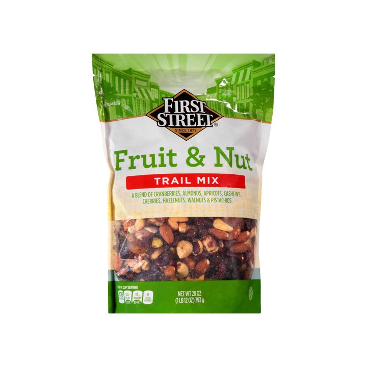 Para un buena botana, rica y nutritva, la mezcla de arándanos, almendras, albaricoques, anacardos, cerezas, avellanas, nueces y pistaches de las nueces y frutas mixtas First Street.