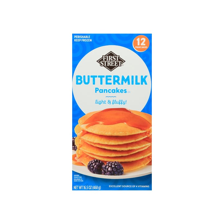 ¿Las prisas no te dejan disfrutar de un rico desayuno? No te preocupes, con nuestros pancakes sabor mantequilla, marca First Street, con 12 piezas, saldrás del apuro y desayunarás delicioso.