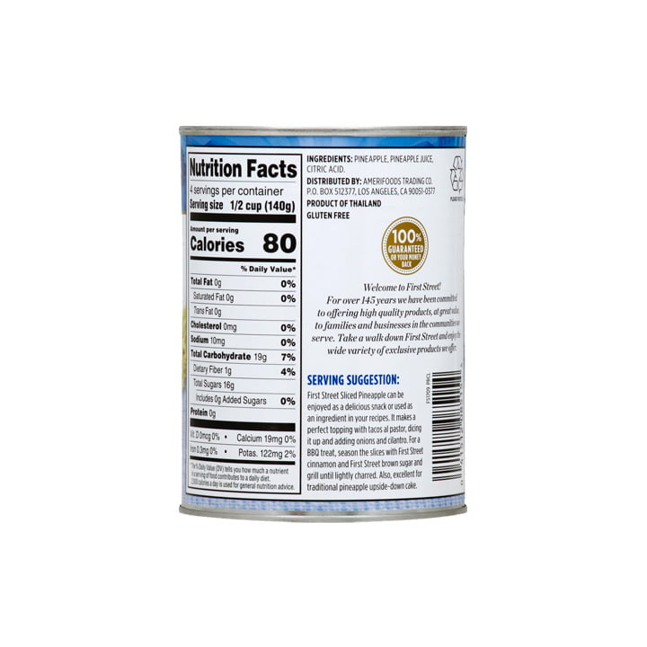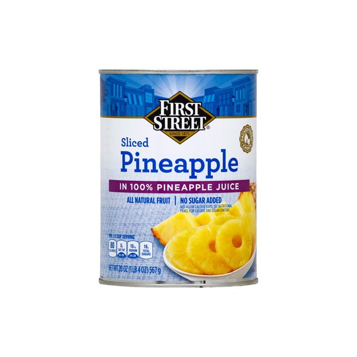 Las rebanadas de piña First Street de 567 gramos, te encantarán al contar con jugo de piña 100% natural, sin azúcares añadidos.