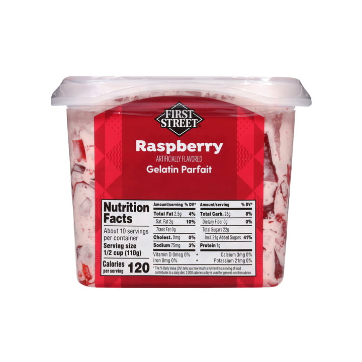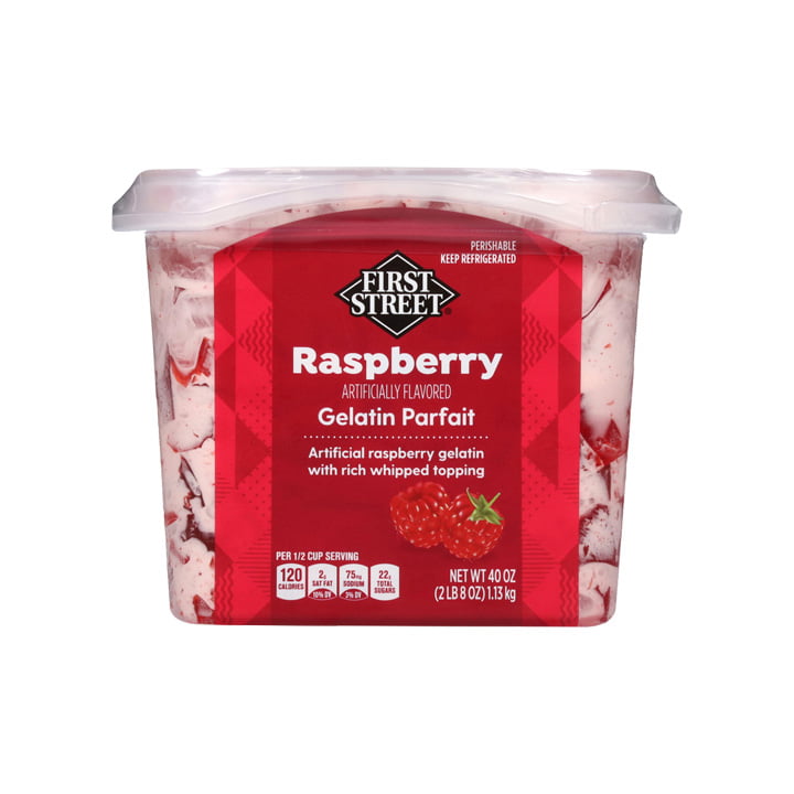 Un postre suave, fresco y de un buen sabor es la gelatina de frambuesa parfait First Street de 1.13 kilogramos, con sabor natural y artificial.