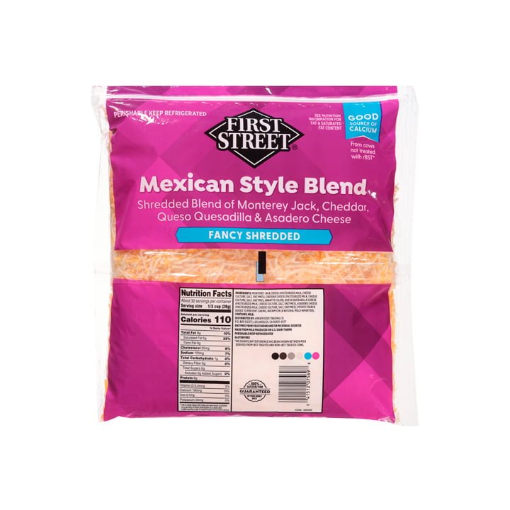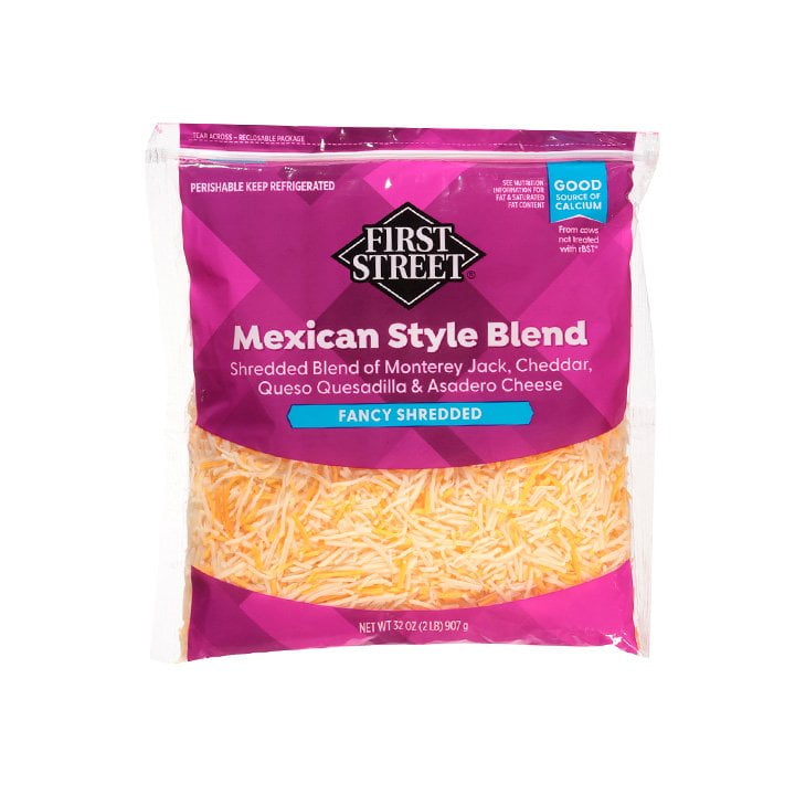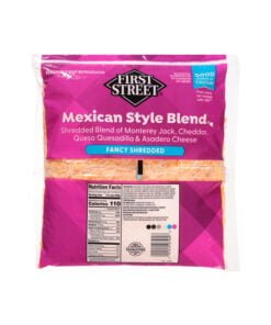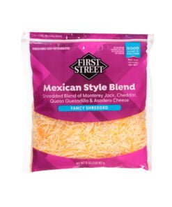 El queso rallado en su mezcla estilo mexicano First Street es perfecto para todos los amantes del queso, con una combinación que reune el queso monterrey, cheddar, queso de quesadilla y queso asadero.