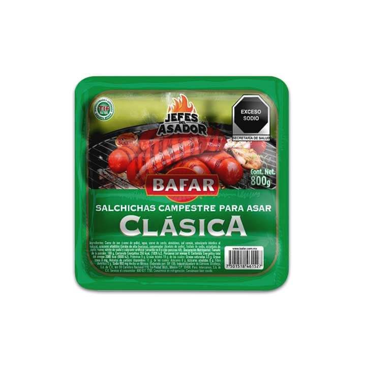 La carne asada y los hot dogs no estarán completos sin la salchicha campestre Bafar de 800 gramos. Disfruta de su sabor a la parilla, al carbón, sárten o como tu gustes más.