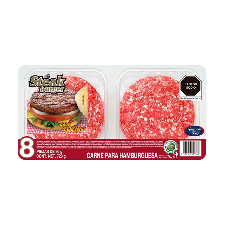 Prepara unas ricas hamburguesas con la carne con tocino para hamburguesas American Beef, perfectas para una parrillada con amigos o familia. Disfruta de su rico sabor con su presentación de 8 piezas.