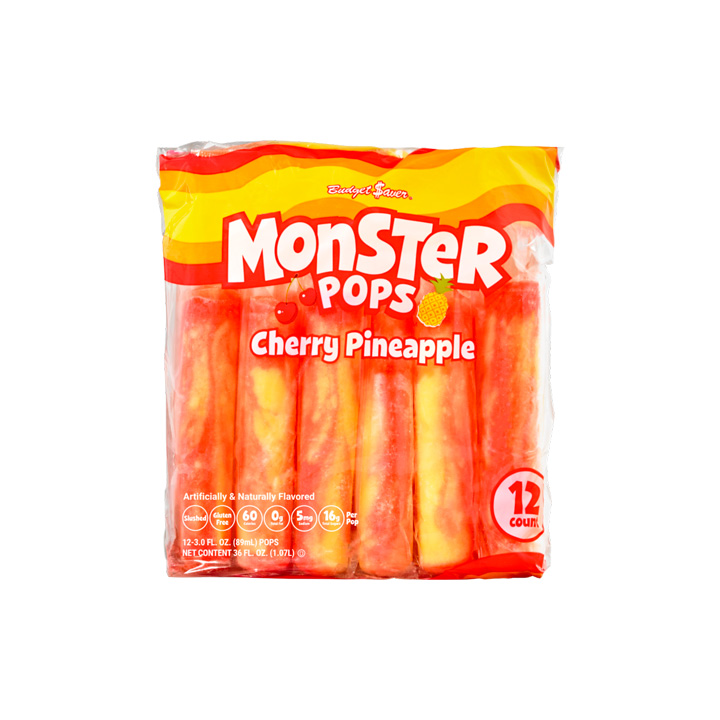 Paletas de nieve Monster pops con sabor piña cereza en su presentación de 12 piezas. Libres de gluten con sabores naturales y artificiales.
