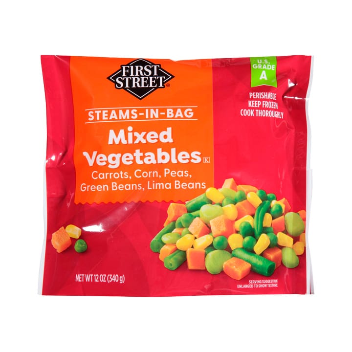 Las combinaciones más ricas son las de verduras frescas de First Street. La mezcla de guisantes, maíz, zanahorias, chícharos y guisantes pequeños de 340 gramos irá perfecto con todo.