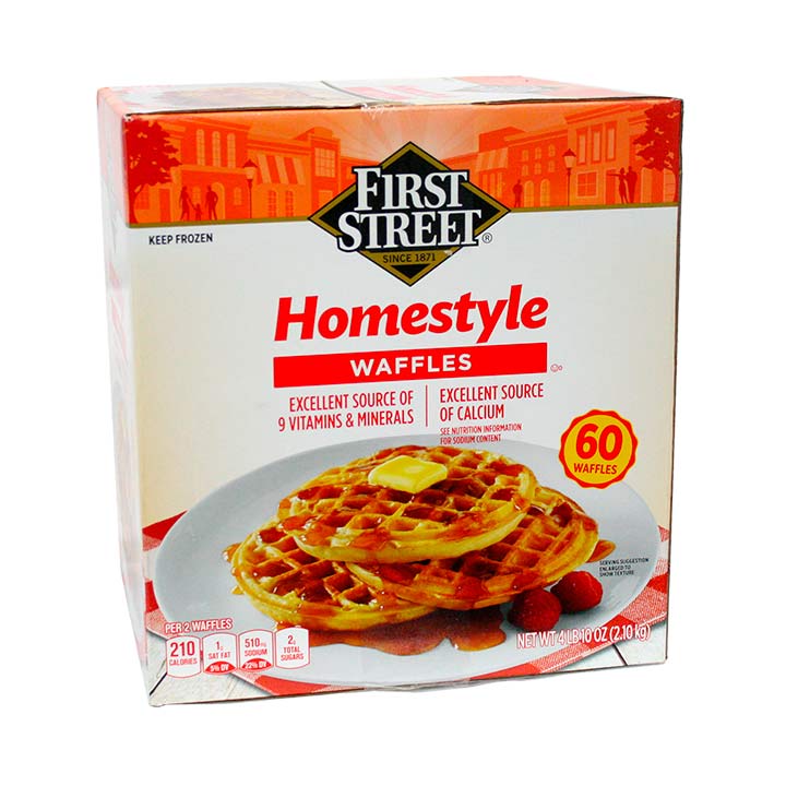 Contenido 60 Waffles ya listos, solo cuestión de precalentarse, su delicioso sabor rico y único te encantaran, ponle plátano, fresa y vierte miel sobre tus Waffles estilo casero de la marca First Street.