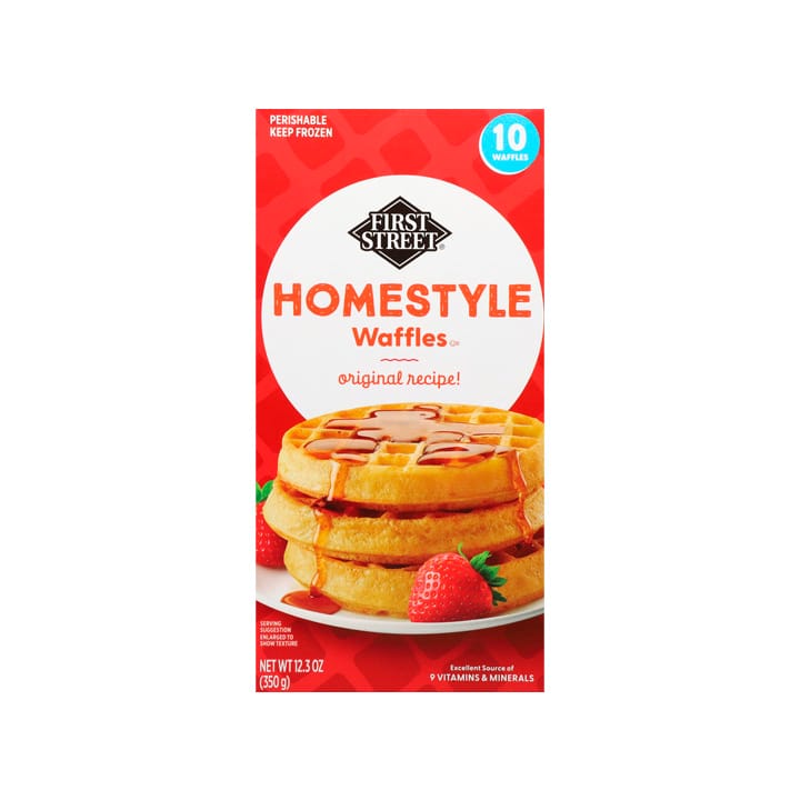 Contenido 10 Waffles ya listos, solo cuestión de precalentarse, su delicioso sabor rico y único te encantaran, ponle plátano, fresa y vierte miel sobre tus Waffles con blueberry de la marca First Street.