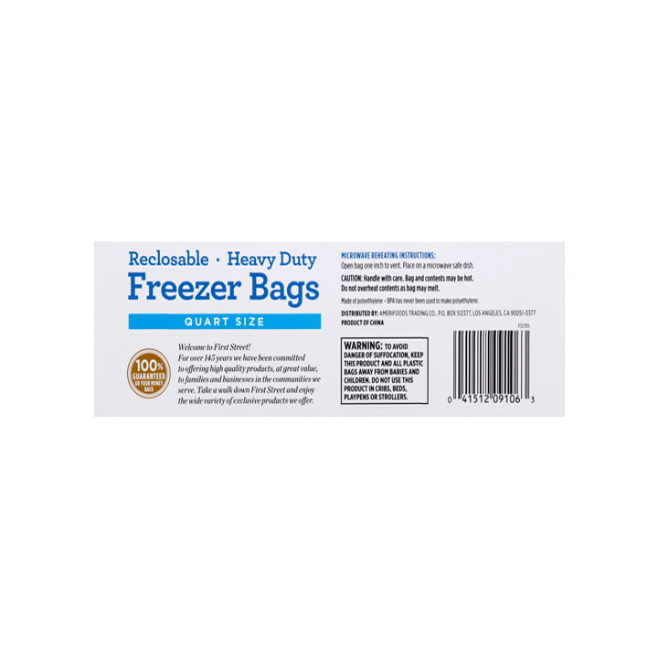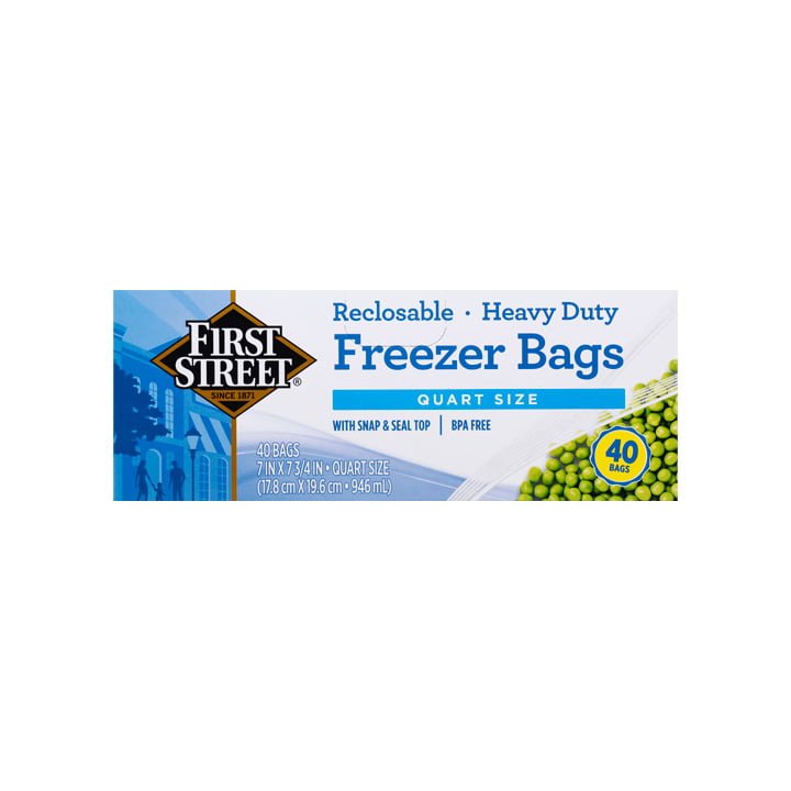 Mánten tus alimentos frescos y ordenados de manera práctica con las bolsas de plástico para congelar First Street de un cuarto.