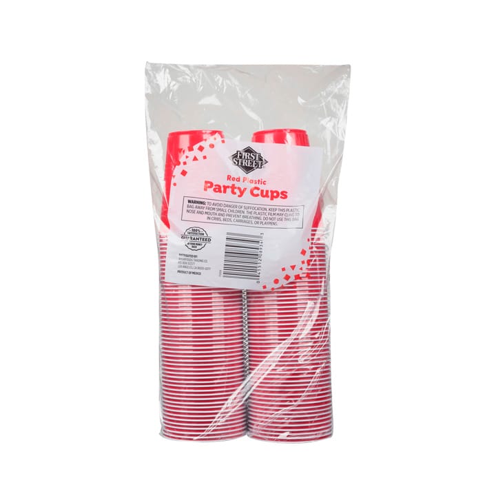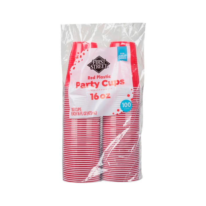 No falten los vasos de plástico rojo con blanco de la marca propia First Street.